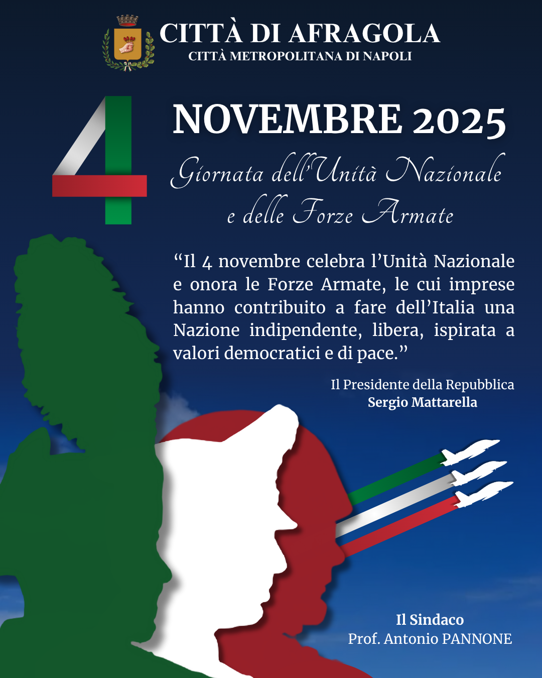 “Il 4 novembre celebra l’Unità Nazionale e onora le Forze Armate, le cui imprese hanno contribuito a fare dell’Italia una Nazione indipendente, libera, ispirata a valori democratici e di pace.” Sergio Mattarella, Presidente della Repubblica
