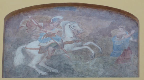 Il frontespizio è abbellito da un ampio finestrone sotto il quale nel 1845 il pittore Donato Vacca affrescò un San Giorgio a cavallo con i singoli della donzella e del dragone.