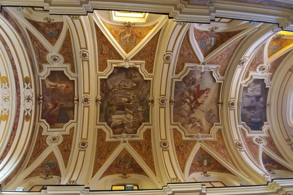 Le otto cappelle laterali lungo la navata contengono statue, dipinti e piccoli altari dedicati a santi. Ognuna è decorata con affreschi che riflettono la devozione popolare.