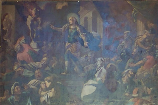 La scena è densa di pathos e movimento: San Giorgio, armato e deciso, distrugge il tempio pagano, mentre i fedeli di Apollo si danno a una disperata e precipitosa fuga, travolti dalla forza della fede cristiana. L’opera colpisce per il bell’insieme di linee che orchestrano la composizione e guidano lo sguardo tra rovine e figure in fuga, ma soprattutto per la chiarezza e nitidezza dei colori, che rendono viva e potente la narrazione sacra.